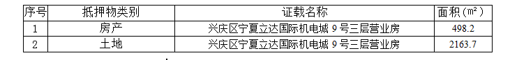 抵押物為興慶區(qū)寧夏立達(dá)國(guó)際機(jī)電城9號(hào)營(yíng)業(yè)房第3層整層,面積共計(jì)2363.44㎡,具體如下: